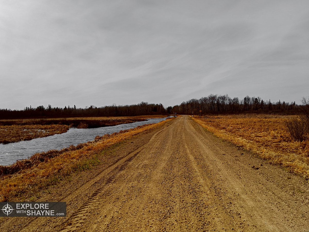 Eventually, the road starts to dip south, through Sandilands Provincial forest. If you follow the road far enough east you get to a point where it crosses a river. The bridge that once stood there is now gone. The only way to get across is to take a long detour along The Trans-Canada Highway and Provincial Road 503.